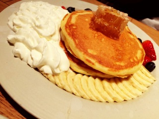 パンケーキの上には、ミツバチの巣蜜が添えられていて、