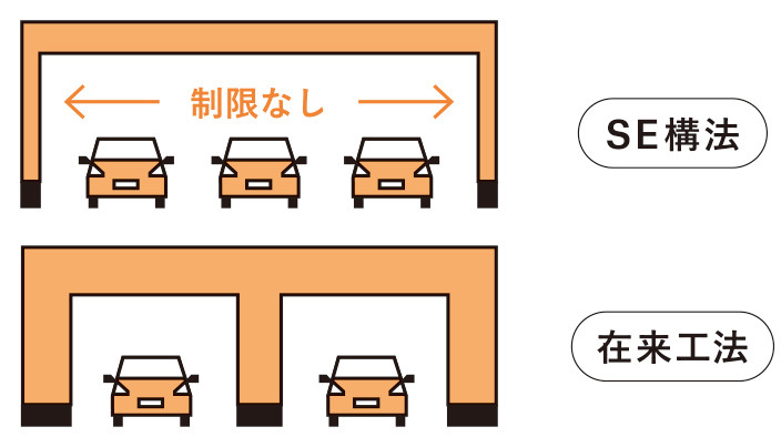 従来の木造住宅は壁や柱に耐力を頼るため、大きな窓や広々とした空間をつくると強度が不足しがちでした。しかしSE構法では鉄骨造に近い考え方を採用しており、強度を保ちながら大空間や大開口の設計が可能になります。